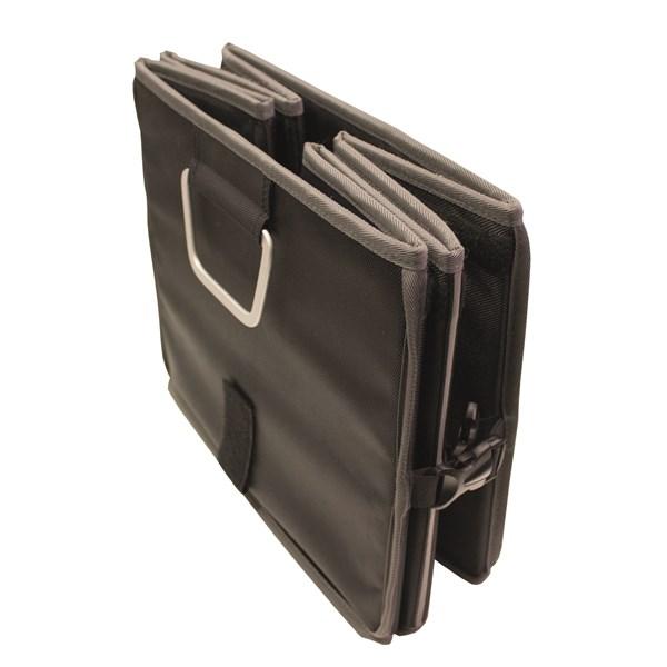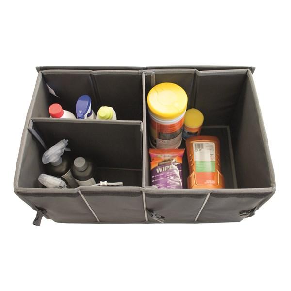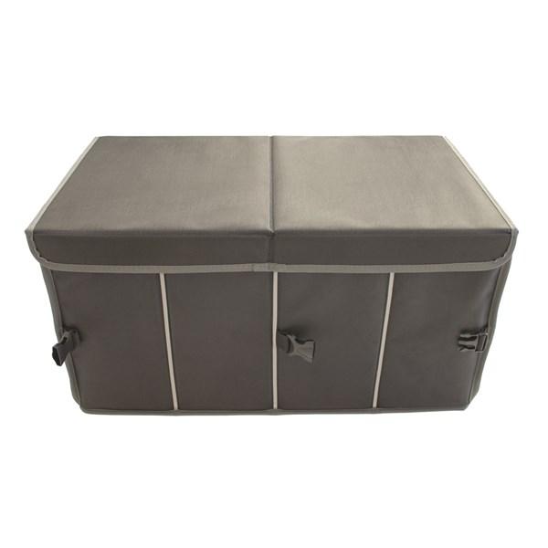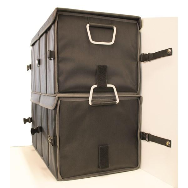 Kätevä kokoontaitettava säilytyslaatikko pehmeää vuorattua materiaalia. Voidaan jakaa lokeroihin, joissa voidaan säilyttää ajokiiloja, sähkökaapeleita, telttatarvikkeita, kemikaaleja ym. Varustettu suojakannella ja jakajilla, jotka voidaan poistaa tarvittaessa. Laatikossa on käytännölliset kantokahvat, jotka toimivat myös kiinnikkeinä, kun laatikoita halutaan pinota sisäkkäin. Laatikko on helppo taittaa kokoon, kun sitä ei käytetä. Mukana kaksi hihnaa kiinnitystä varten.