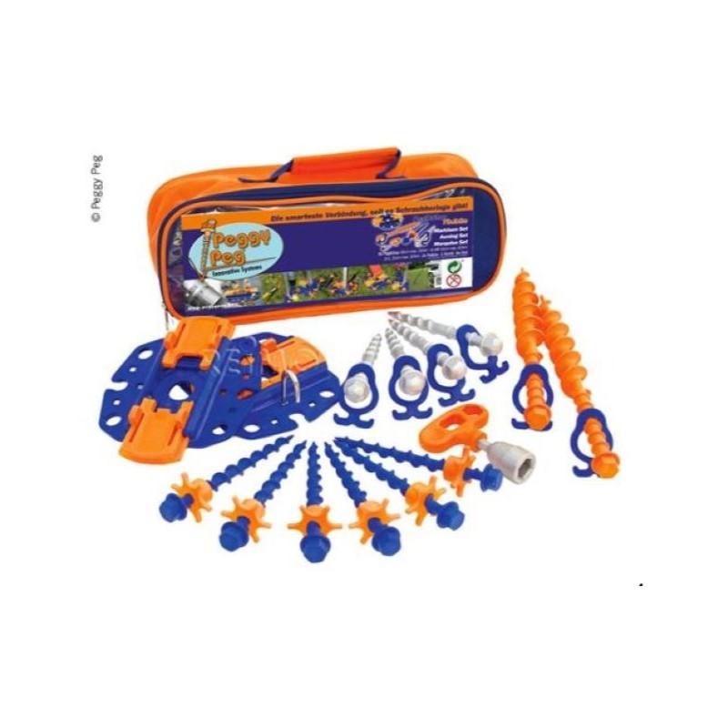 Pakkauksen sisältö: 6 Peg&Stop lukkomutteria 16 cm, 4 iskuruuvitappia HC 15 cm, 2 Peggys L 31 cm plus Kombi-työkalu alumiinisovittimella ja 1 pari Fix&Go-ankkurilevy 2.0 myrskykoukulla, säilytyspussi (100% polyesteriä) (ilman hihnaa).