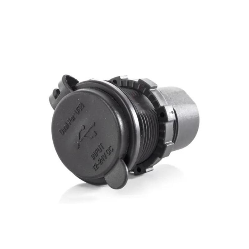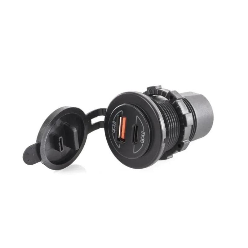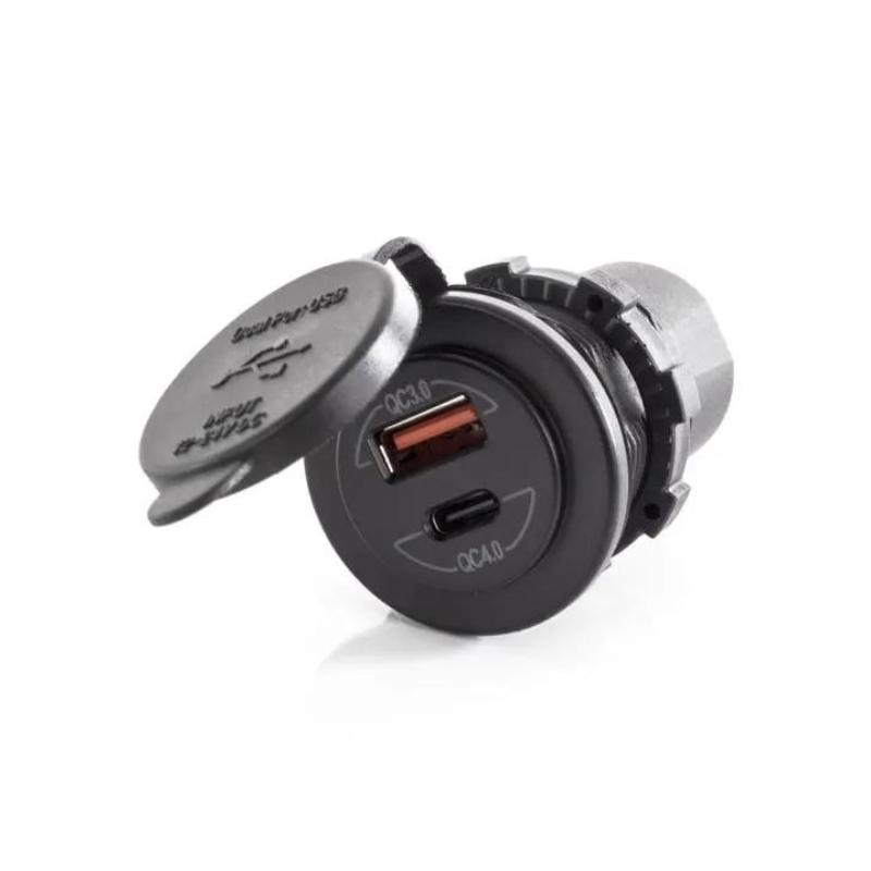 Sisäänrakennettu USB-liitäntä, sisältää suojakannen kahdella USB-portilla: 1x USB-A ja 1x USB-C Tulo: 12V/24 Ulostulo USB-A: QC 3.0 (3,6 V – 12 V, max. 32 W) Ulostulo USB-C: QC 4.0 (5V – 20V, max. 60W) Reiän halkaisija: ø 29 mm Toimituksen laajuus: sisäänrakennettu pistorasia, 2 teräliitintä, täysin eristetty